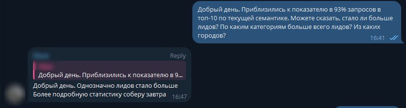 "Результаты работы команды превзошли наши ожидани я! Детальный план SEO-оптимизации, регулярная отчетность и погруженность в проект позволили достичь того, к чему мы так долго стремились. Наши ключевые запросы наконец-то в ТОПе поисковиков! А рост продаж и лидов доказал, что каждое вложение в развитие сайта было оправданным. Спасибо за проделанную работу!"
