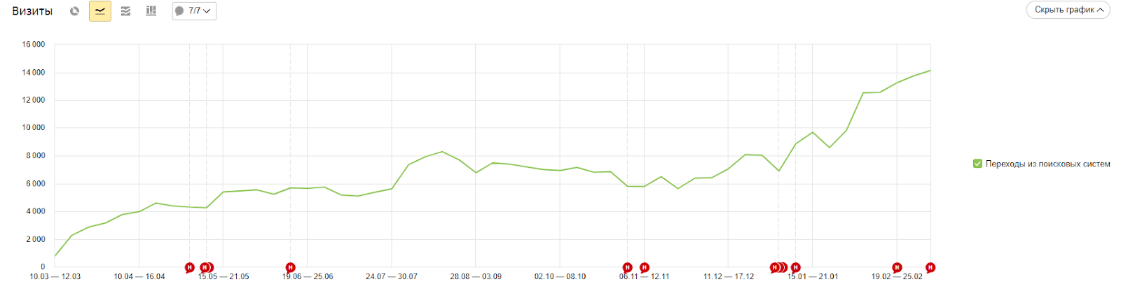 - Количество трафика с поисковых систем выросло в 2,3 раза с 23 000 до 49 000 посетителей в месяц