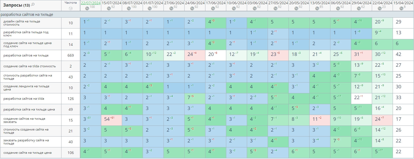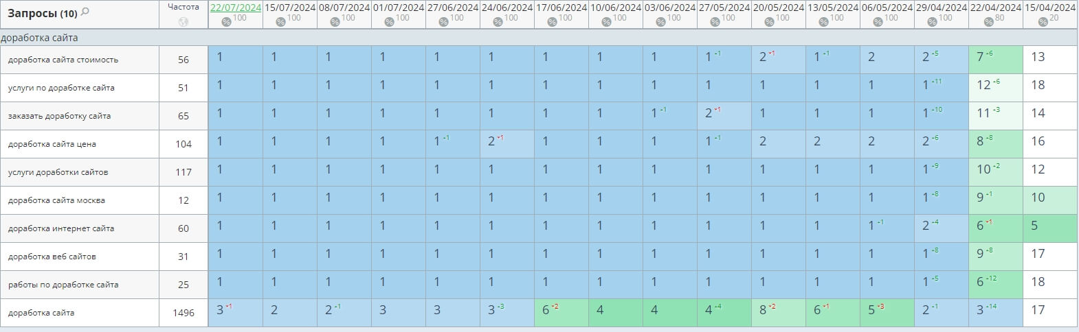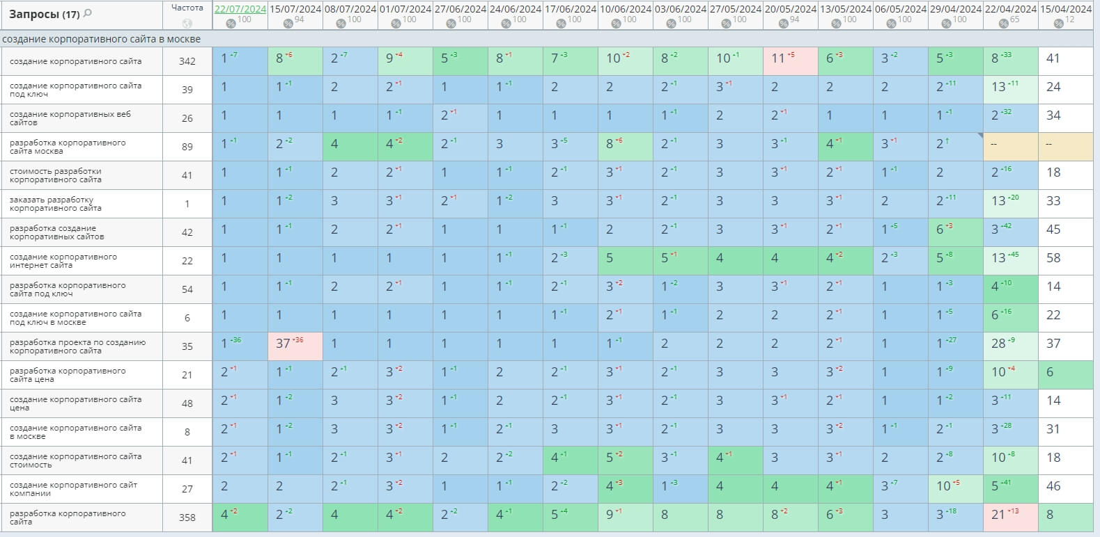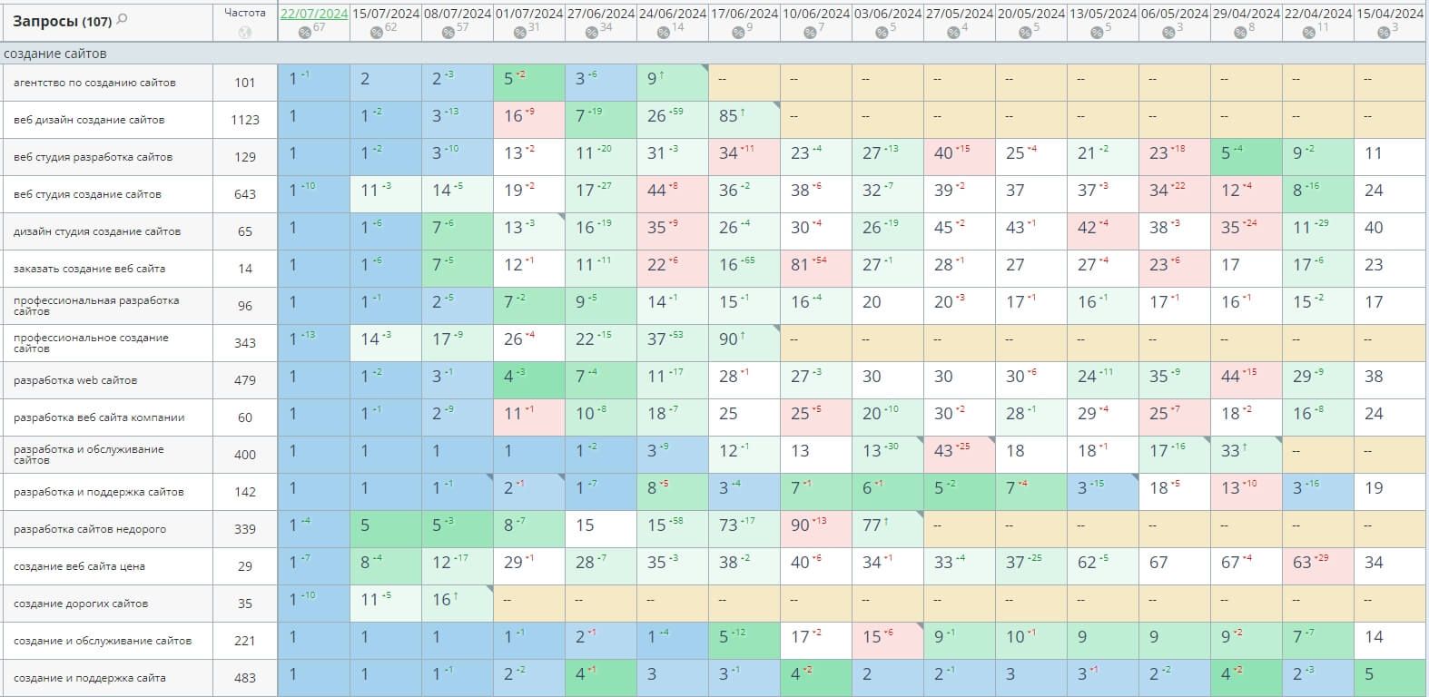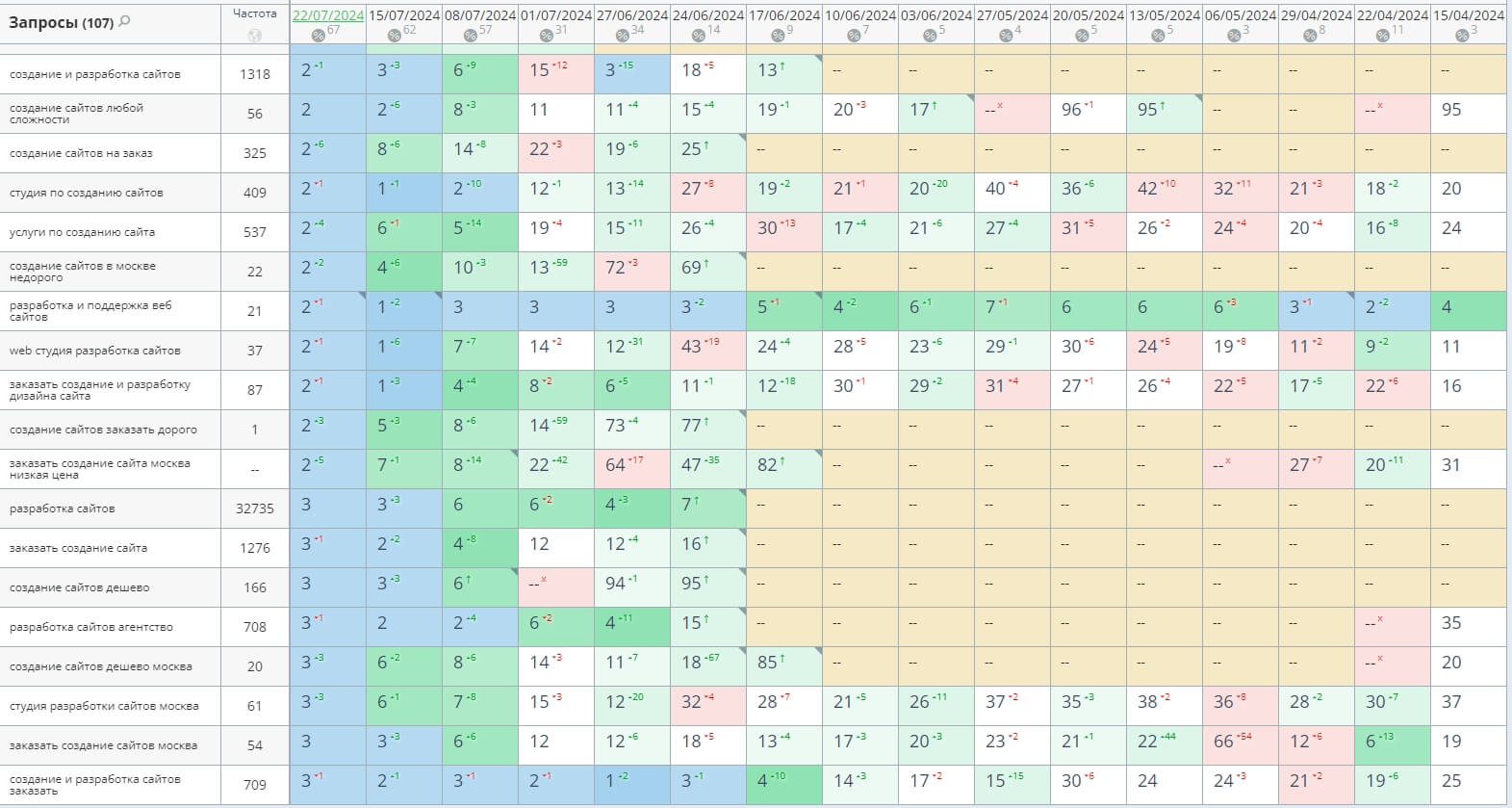 - "Создание сайтов": значительное улучшение позиций в ТОП-10