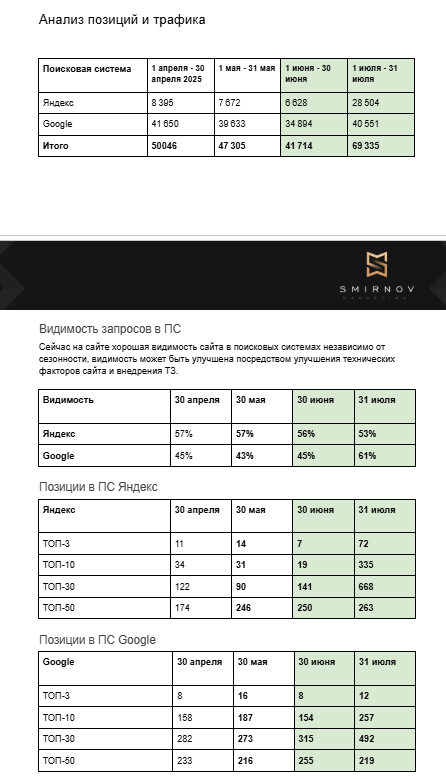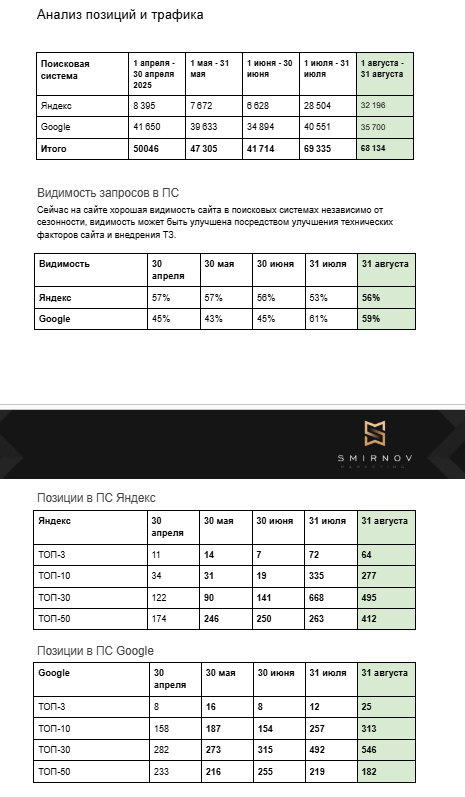 В ТОП-10 Яндекса было 34 запроса, стало 127 — рост в 4 раза. В ТОП-30 было 122, стало 540 — рост в 4,4 раза. Google показал рост позиций в ТОП-3 с 8 до 26, в ТОП-10 с 158 до 275. Видимость: Яндекс остался на уровне 56-57%, но качество позиций кардинально улучшилось — теперь это топовые места. Google вырос с 45% до 60%.