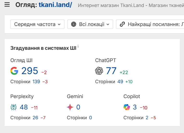 Запустили Яндекс.Дзен — оказалось, что на аудиторию магазина тканей (женщины 40+) эта площадка работает отлично. Писали статьи на внешних сайтах, активно работали на форумах рукодельниц. К концу периода сайт начали цитировать даже AI-поисковики — ChatGPT и Google AI.